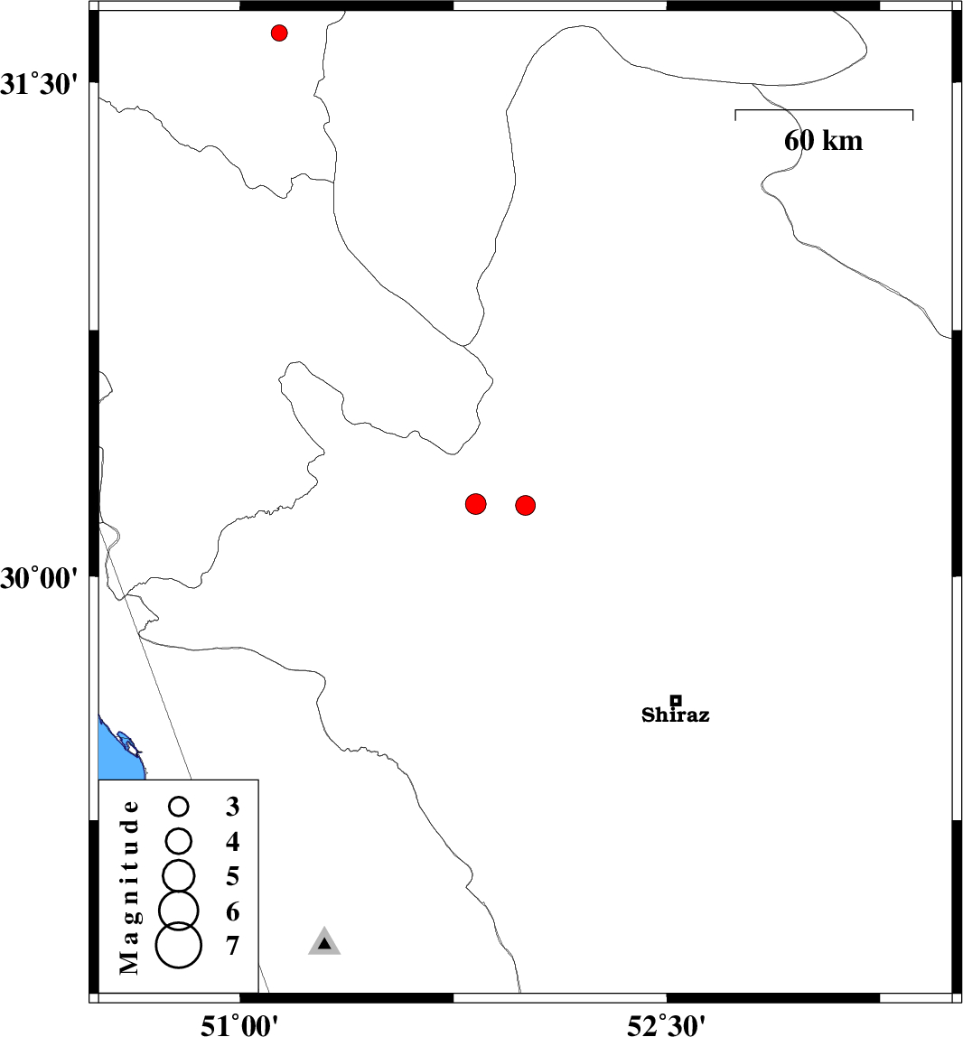 | 2016/04/23 | 16:38:00.1 | 21:08:00.1 | 30.22 | 51.829 | 14 | ML3.3 | Fars Province, 16 km -West of Ardakan | ||