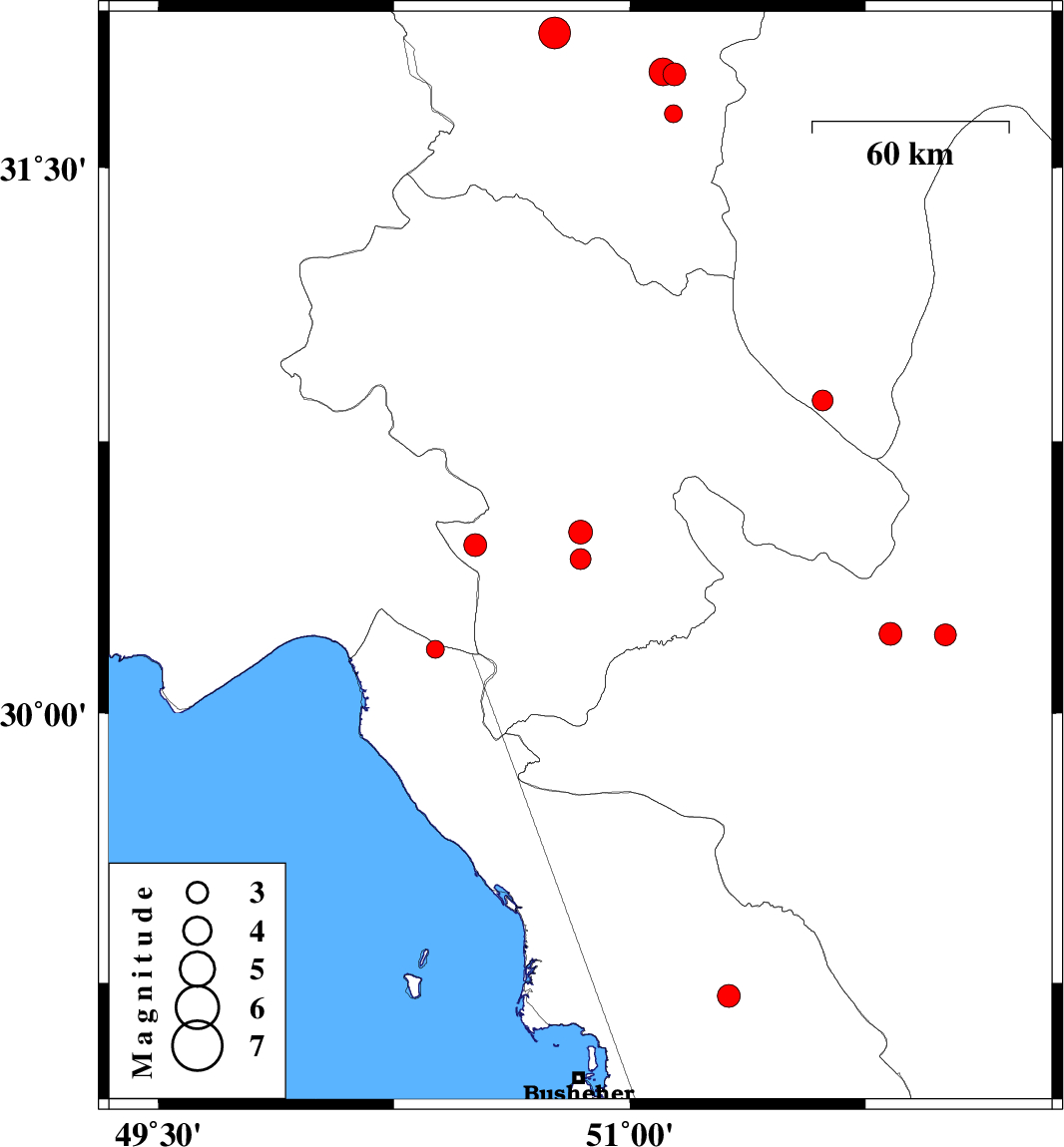 | 2016/04/01 | 01:32:46.9 | 06:02:46.9 | 29.213 | 51.315 | 5 | ML3.2 | Bushehr Province, 12 km -East of Borazjan | ||