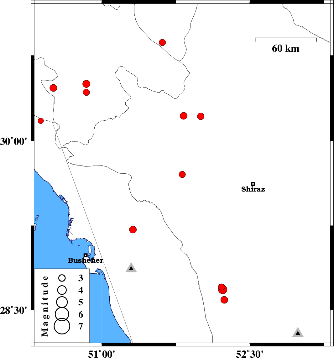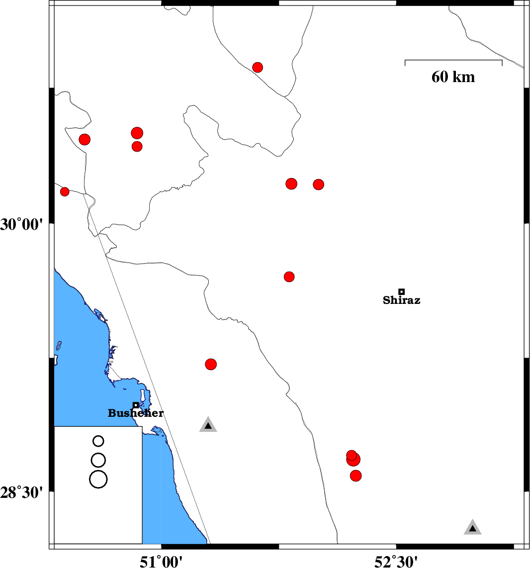 | 2016/05/01 | 23:48:01.6 | 04:18:01.6 | 29.703 | 51.815 | 12 | ML3 | Fars Province, 18 km -East of Kazerun | ||