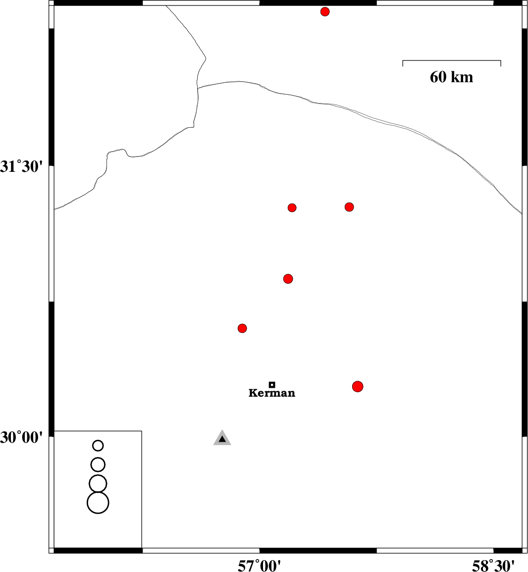 | 2016/04/08 | 07:46:50.0 | 12:16:50.0 | 30.602 | 56.889 | 14 | ML2.5 | Kerman Province, 39 km North-West of Kerman |