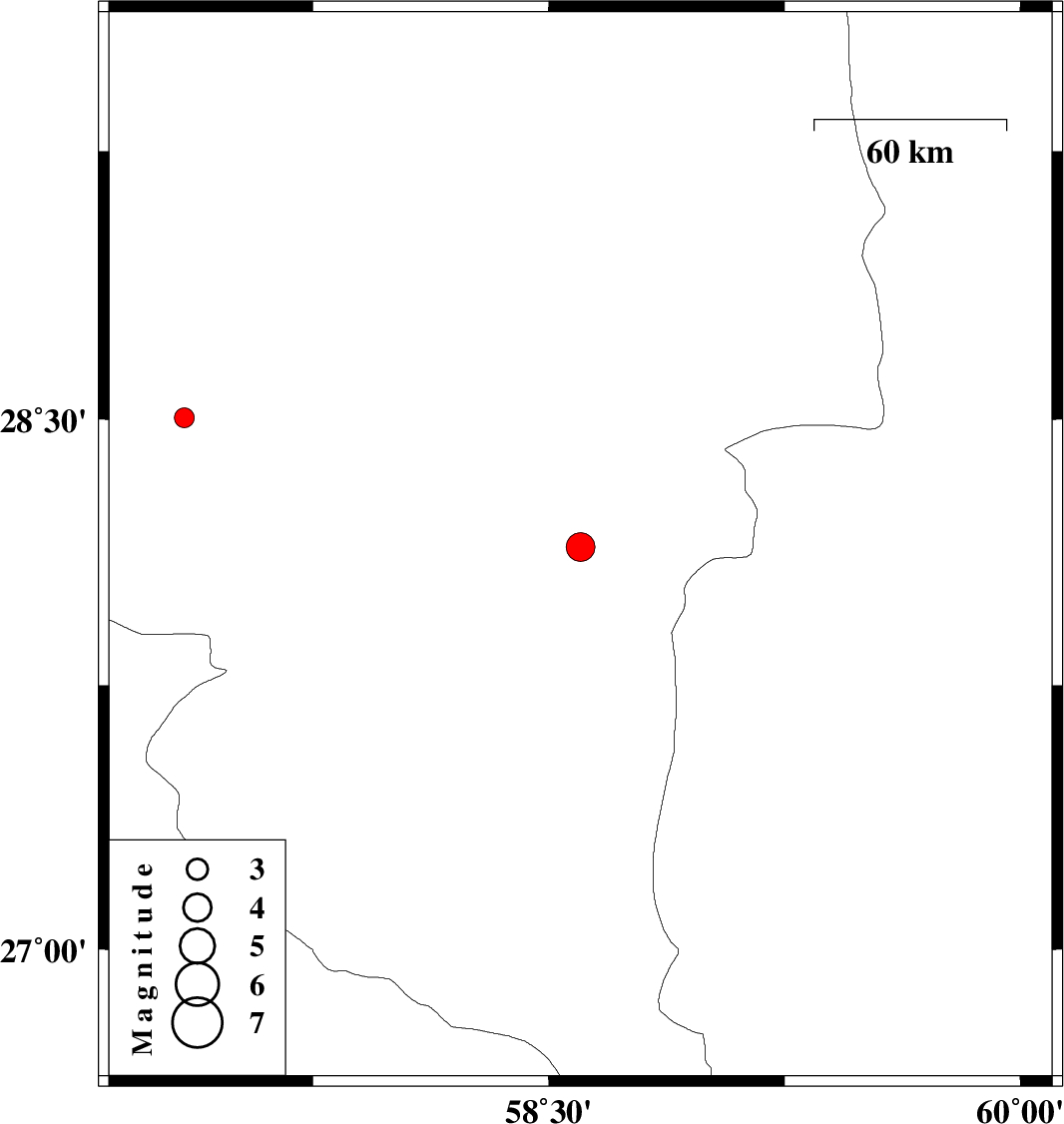 | 2016/05/20 | 11:59:09.5 | 16:29:09.5 | 28.14 | 58.601 | 15 | ML4.1 | Kerman Province, 91 km North-East of Kahnuj | ||