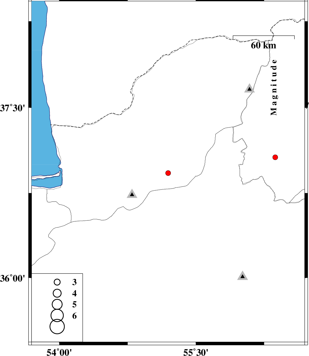 | 2016/04/22 | 07:38:00.3 | 12:08:00.3 | 37.066 | 56.372 | 15 | ML2.6 | Khorasan(north) Province, 13 km North of Jajarm |