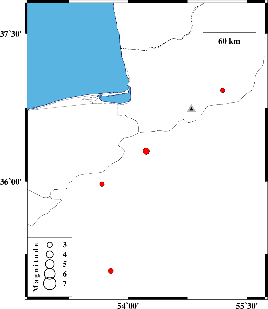 | 2016/05/24 | 15:32:57.6 | 20:02:57.6 | 36.309 | 54.229 | 14 | ML3.7 | Semnan Province, 19 km North-West of Damghan | ||