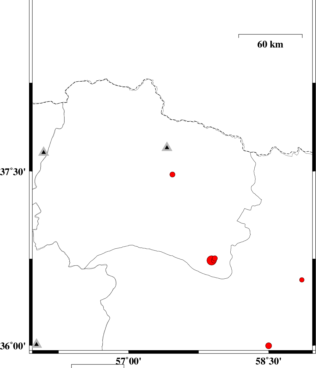 | 2016/05/11 | 12:38:33.1 | 17:08:33.1 | 37.292 | 58.436 | 14 | ML2.2 | Khorasan(center) Province, 21 km North of Quchan | ||
