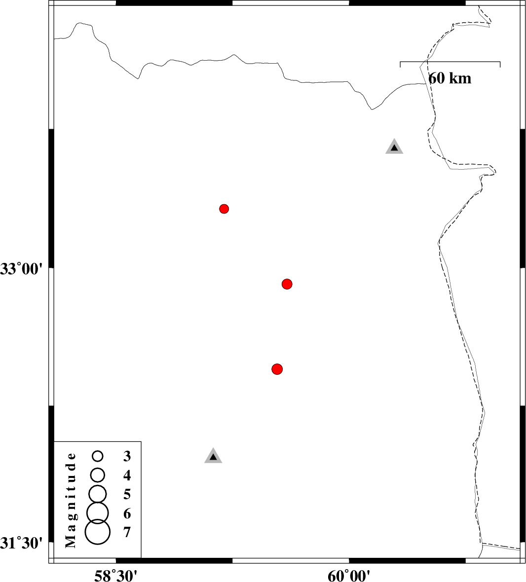 | 2016/05/25 | 20:08:53.7 | 00:38:53.7 | 32.912 | 59.6 | 6 | ML2.9 | Khorasan(south) Province, 35 km -East of Birjand | ||