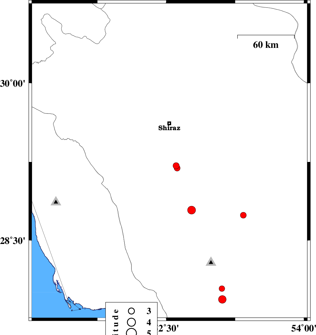 | 2016/05/01 | 23:48:01.6 | 04:18:01.6 | 29.703 | 51.815 | 12 | ML3 | Fars Province, 18 km -East of Kazerun |