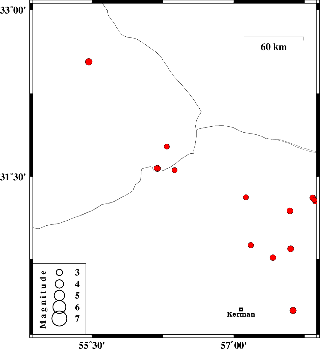 | 2016/05/13 | 10:54:55.6 | 15:24:55.6 | 30.763 | 57.415 | 14 | ML2.8 | Kerman Province, 62 km North-East of Kerman | ||