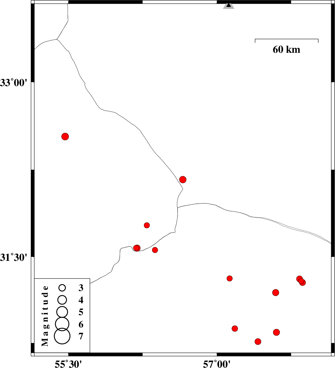 | 2016/05/13 | 10:54:55.6 | 15:24:55.6 | 30.763 | 57.415 | 14 | ML2.8 | Kerman Province, 62 km North-East of Kerman | ||