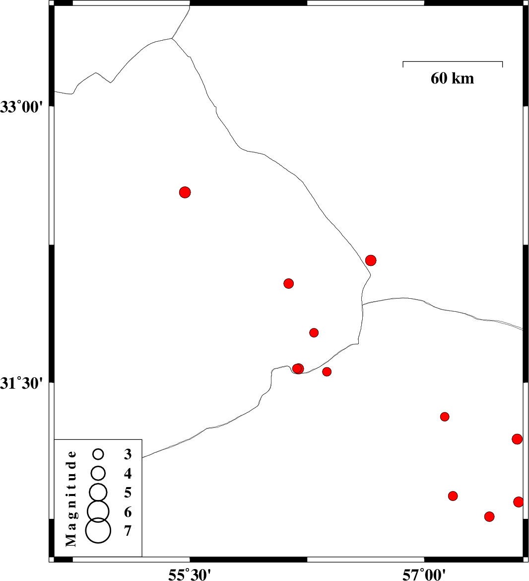 | 2016/05/25 | 03:28:53.4 | 07:58:53.4 | 30.843 | 57.603 | 14 | ML2.9 | Kerman Province, 99 km -East of Zarand | ||