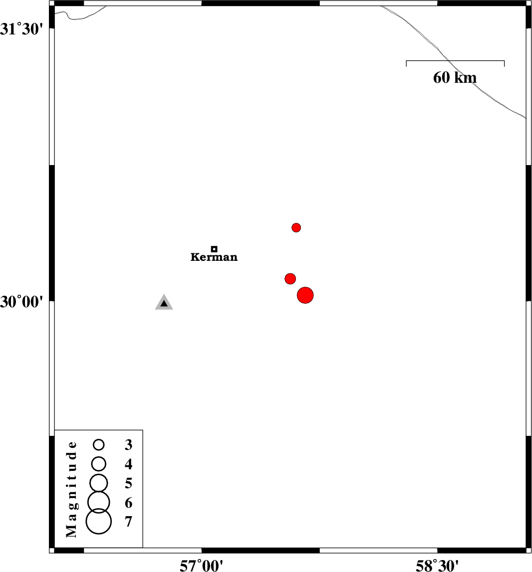 | 2016/06/04 | 09:54:13.6 | 14:24:13.6 | 30.032 | 57.658 | 6 | ML4.6 | Kerman Province, 63 km South-East of Kerman | ||