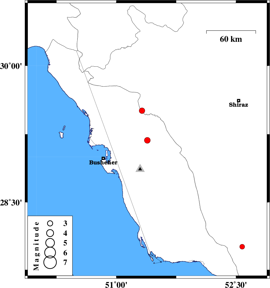 | 2016/06/06 | 04:06:55.5 | 08:36:55.5 | 29.508 | 51.321 | 6 | ML3.3 | Fars Province, 30 km North-East of Borazjan |