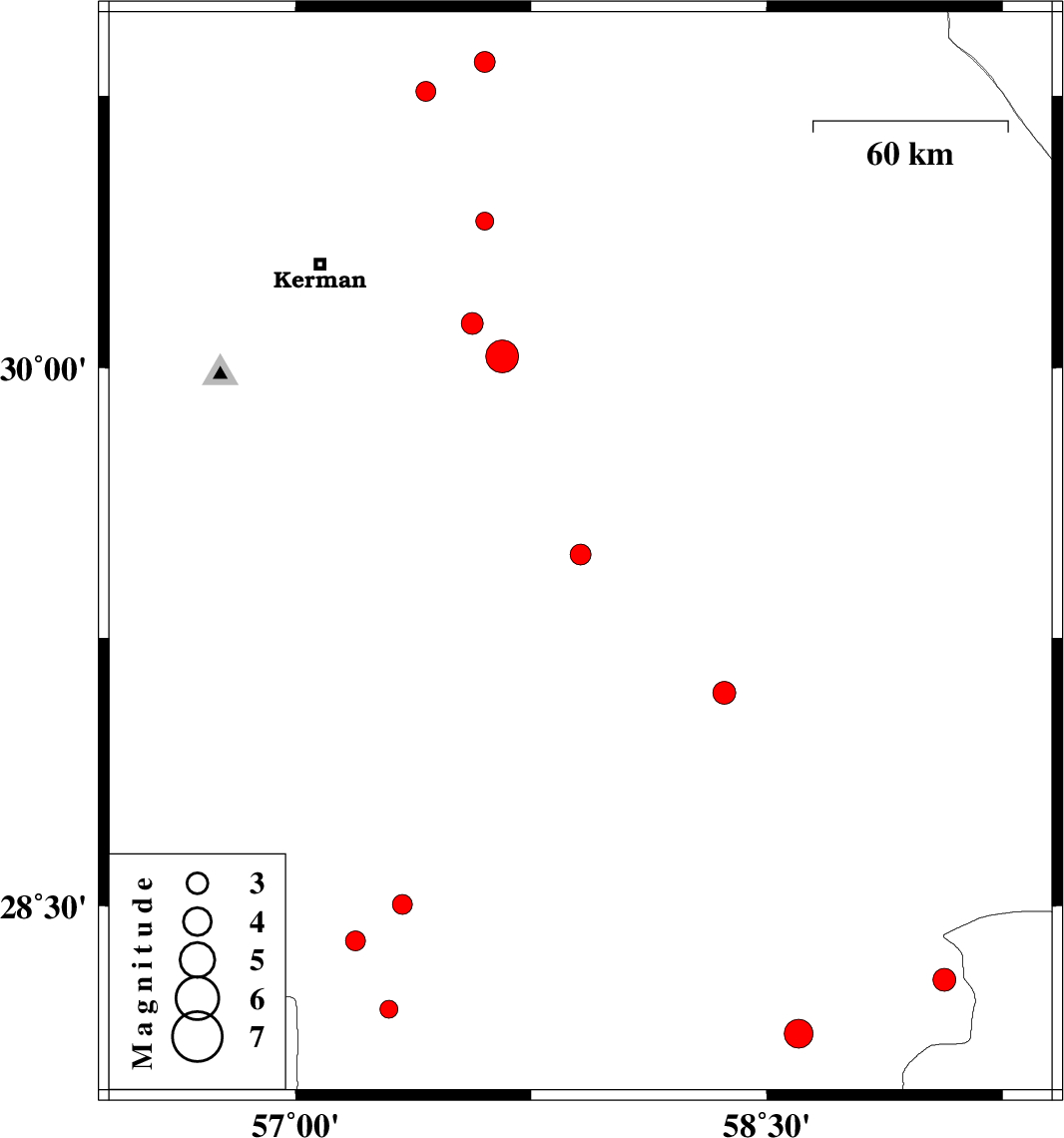 | 2016/05/13 | 10:54:55.6 | 15:24:55.6 | 30.763 | 57.415 | 14 | ML2.8 | Kerman Province, 62 km North-East of Kerman |