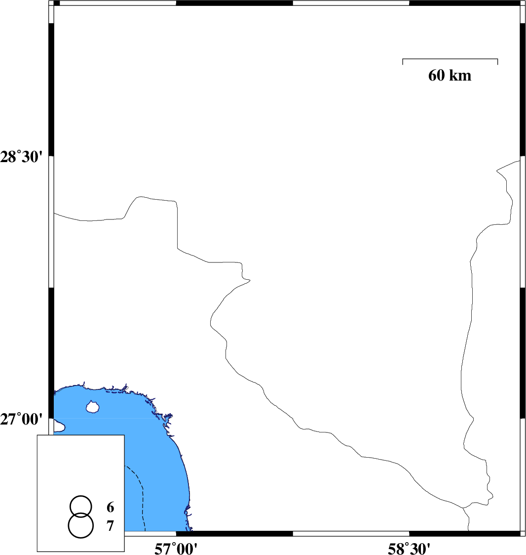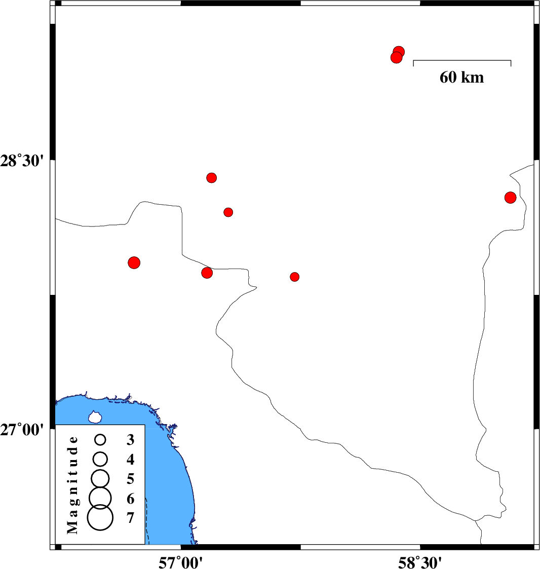 | 2016/06/20 | 03:58:18.2 | 08:28:18.2 | 27.85 | 57.712 | 15 | ML2.6 | Kerman Province, 11 km South of Kahnuj | ||