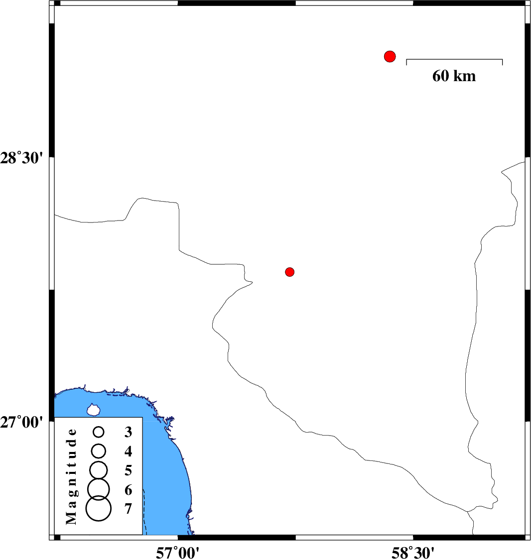 | 2016/06/20 | 03:58:18.2 | 08:28:18.2 | 27.85 | 57.712 | 15 | ML2.6 | Kerman Province, 11 km South of Kahnuj | ||