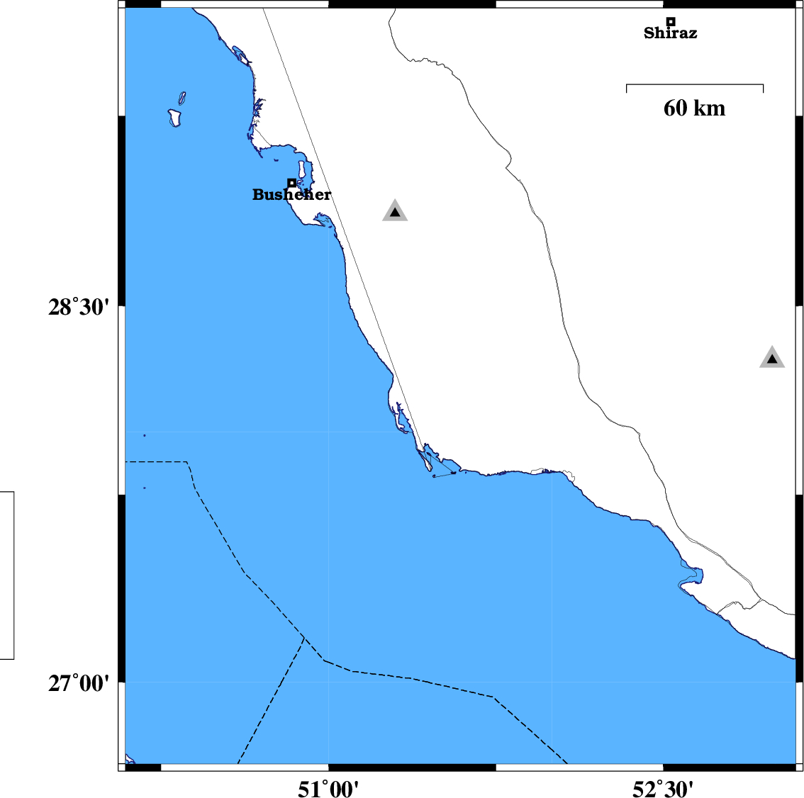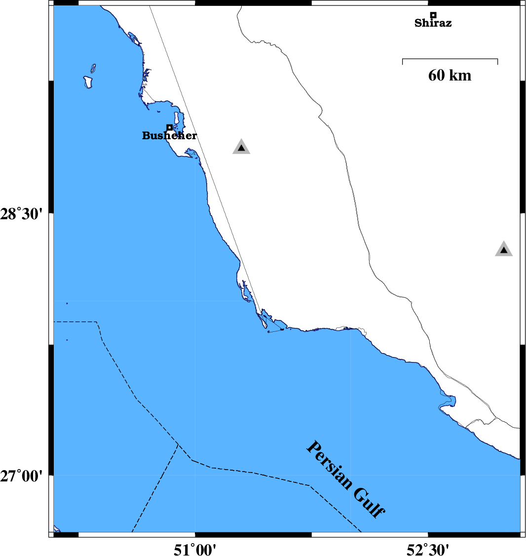 | 2016/06/25 | 20:14:14.8 | 00:44:14.8 | 28.173 | 51.591 | 16 | ML3.7 | Bushehr Province, 57 km South-East of Khormog |