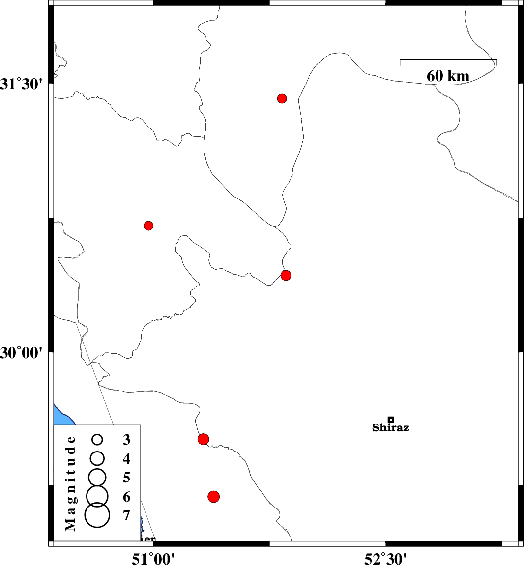 | 2016/06/06 | 04:06:55.5 | 08:36:55.5 | 29.508 | 51.321 | 6 | ML3.3 | Fars Province, 30 km North-East of Borazjan | ||