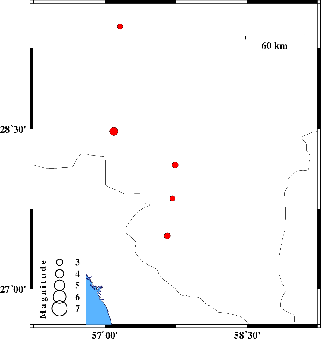 | 2016/06/20 | 03:58:18.2 | 08:28:18.2 | 27.85 | 57.712 | 15 | ML2.6 | Kerman Province, 11 km South of Kahnuj |
