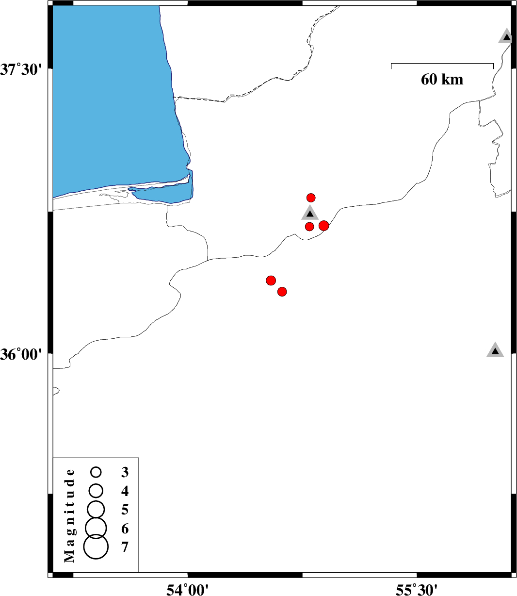 | 2016/06/13 | 00:26:25.4 | 04:56:25.4 | 36.676 | 54.891 | 14 | ML2.9 | Golestan Province, 26 km South of Ali Abad | ||