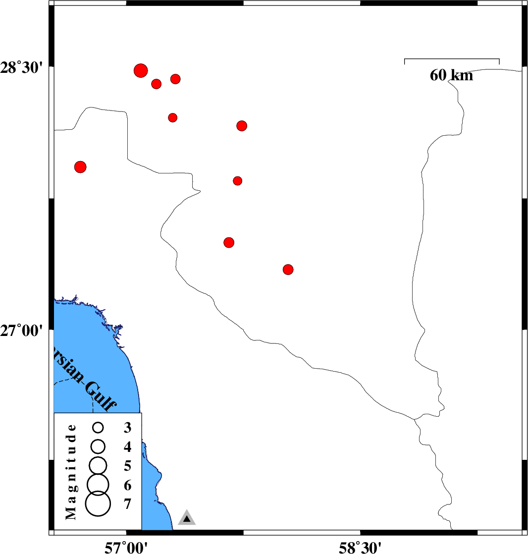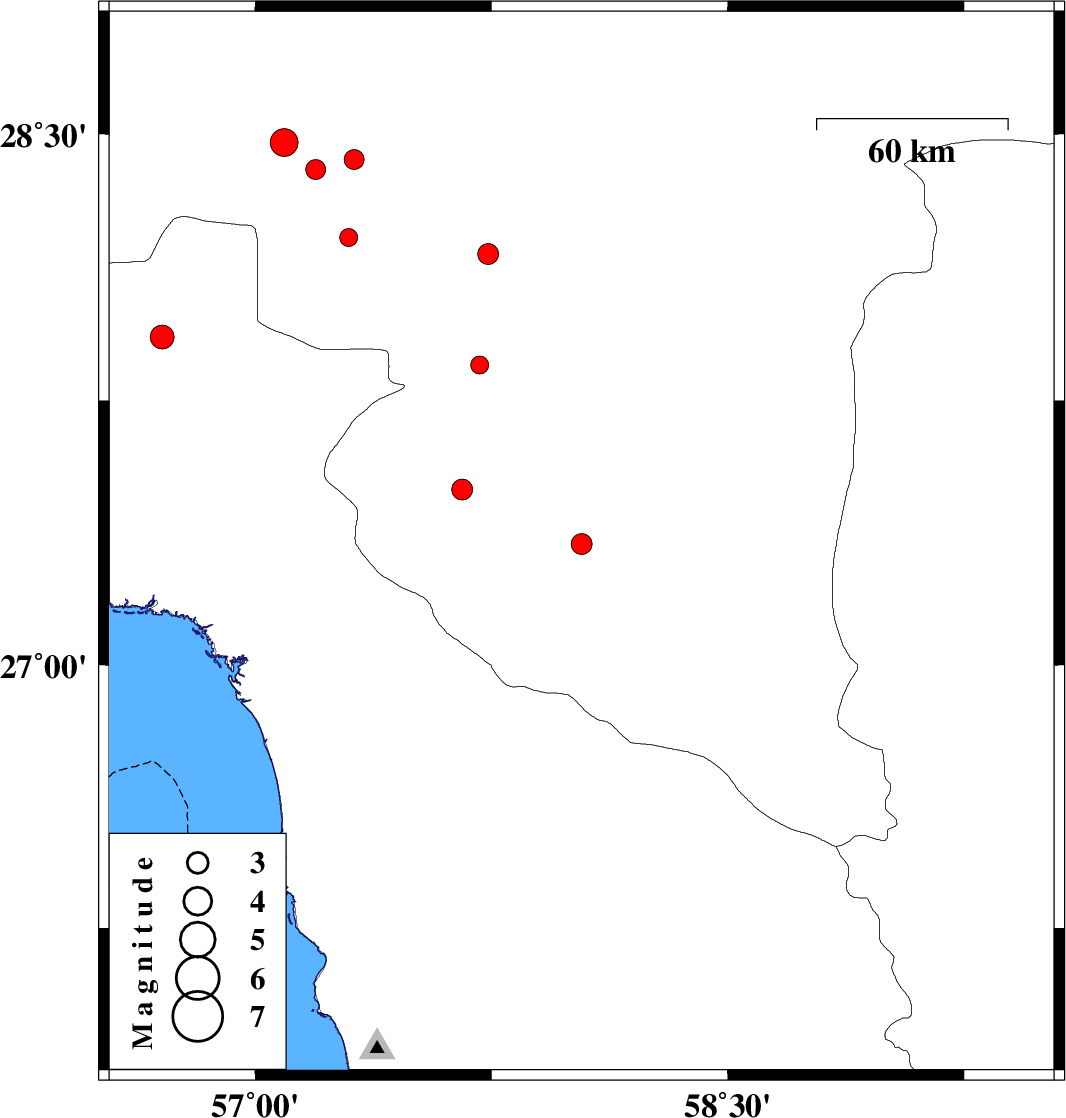 | 2016/06/20 | 03:58:18.2 | 08:28:18.2 | 27.85 | 57.712 | 15 | ML2.6 | Kerman Province, 11 km South of Kahnuj | ||