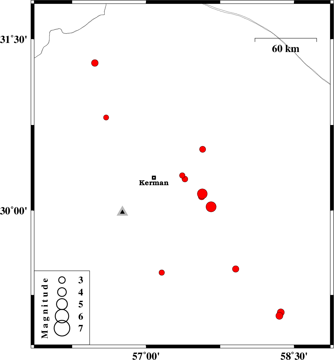 | 2016/06/04 | 09:54:13.6 | 14:24:13.6 | 30.032 | 57.658 | 6 | ML4.6 | Kerman Province, 63 km South-East of Kerman |