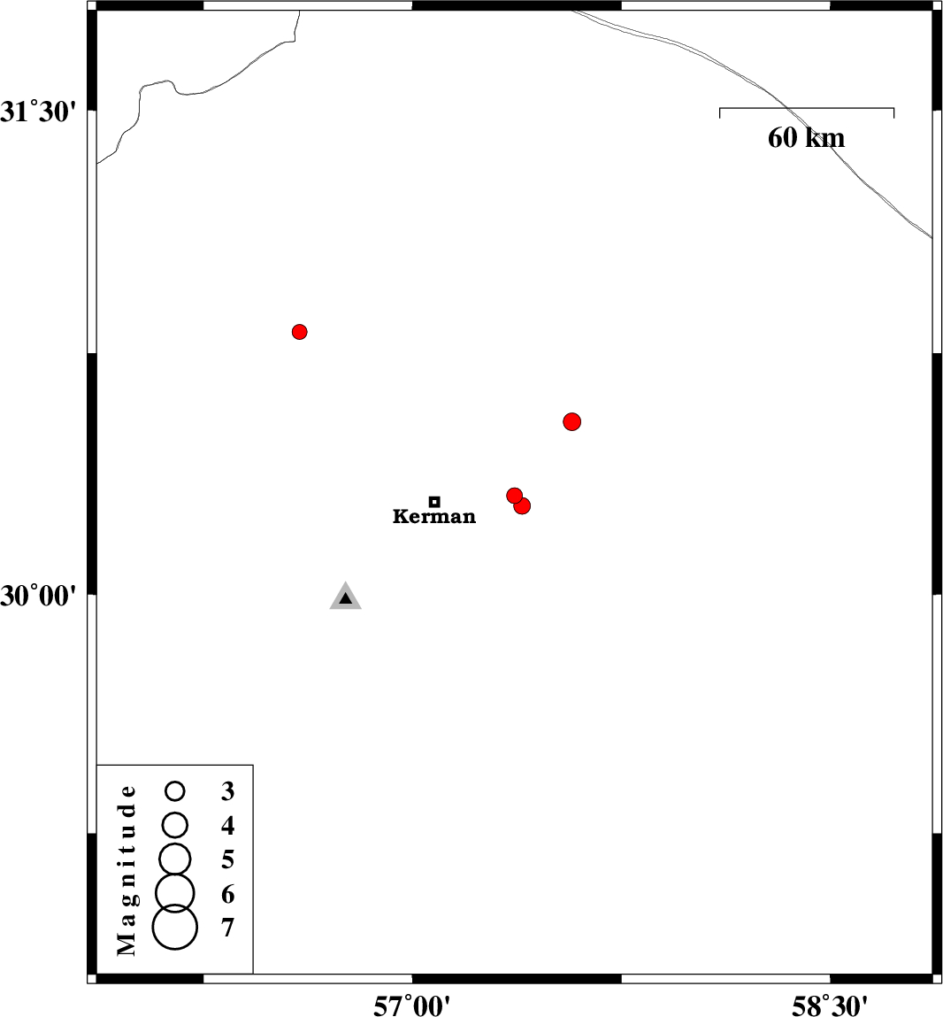 2016/06/30 | 00:41:39.2 | 05:11:39.2 | 30.307 | 57.366 | 14 | ML2.6 | Kerman Province, 28 km -East of Kerman | ||