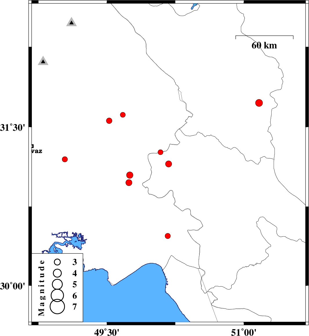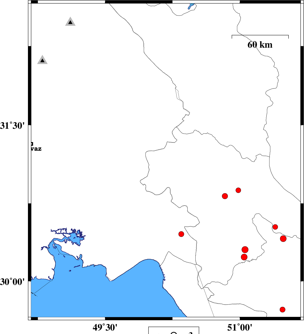 | 2016/06/29 | 09:13:52.1 | 13:43:52.1 | 31.559 | 49.526 | 15 | ML2.8 | Khoozestan Province, 32 km North of Ramhormoz | ||