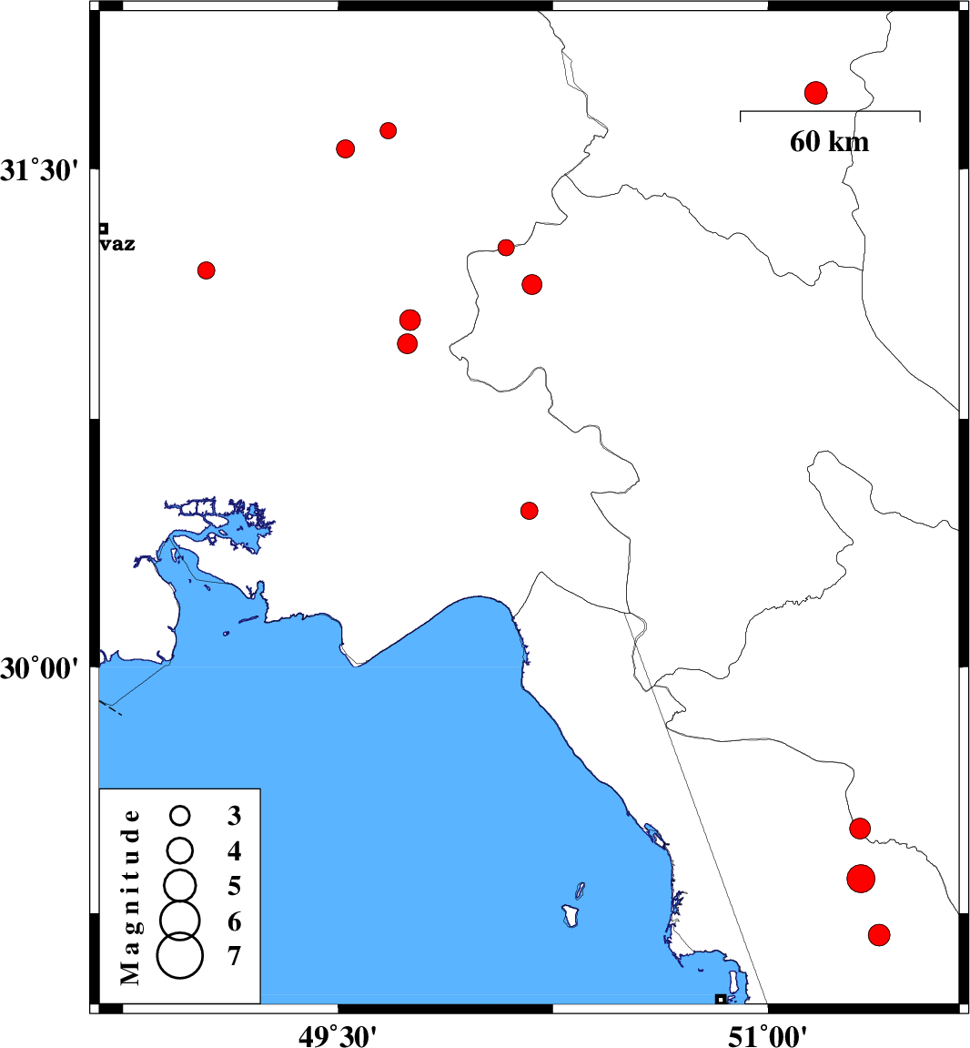 | 2016/06/06 | 04:06:55.5 | 08:36:55.5 | 29.508 | 51.321 | 6 | ML3.3 | Fars Province, 30 km North-East of Borazjan |