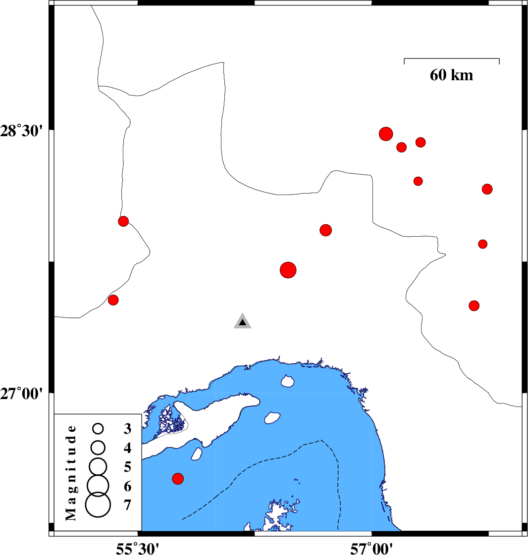 | 2016/06/20 | 03:58:18.2 | 08:28:18.2 | 27.85 | 57.712 | 15 | ML2.6 | Kerman Province, 11 km South of Kahnuj | ||