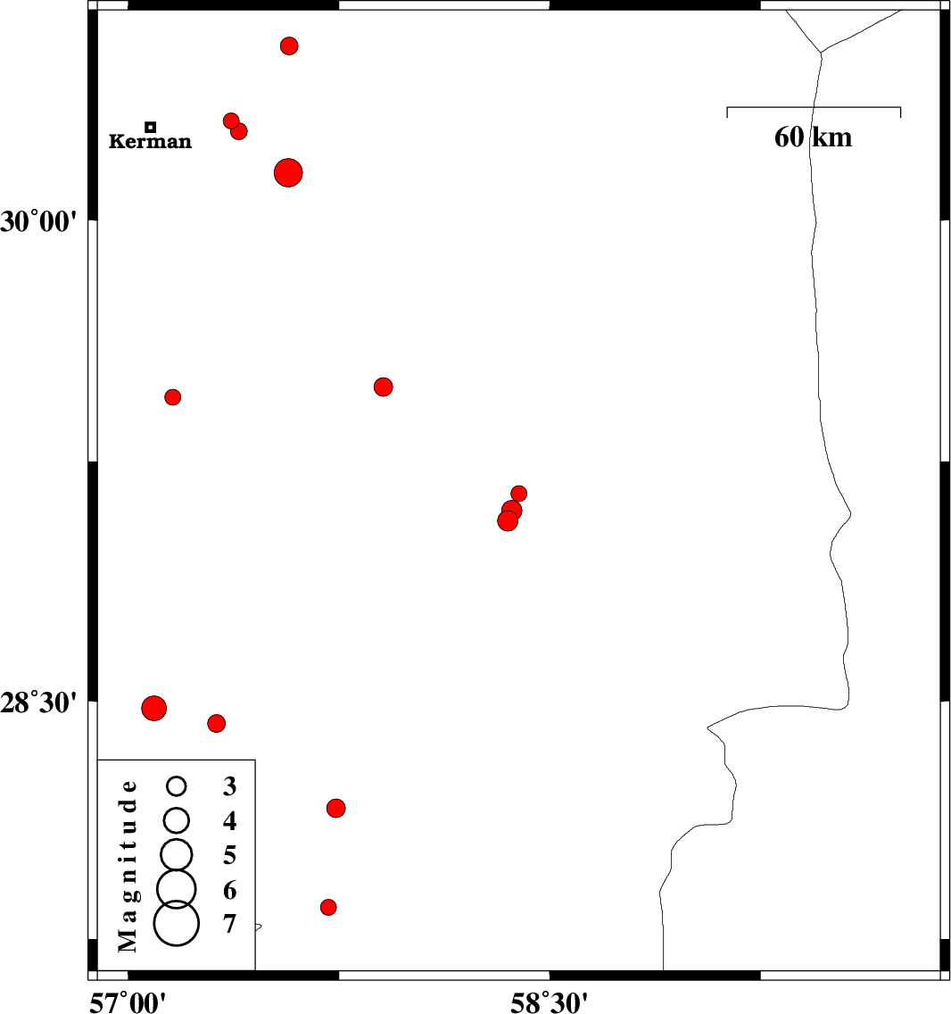 | 2016/06/20 | 03:58:18.2 | 08:28:18.2 | 27.85 | 57.712 | 15 | ML2.6 | Kerman Province, 11 km South of Kahnuj | ||