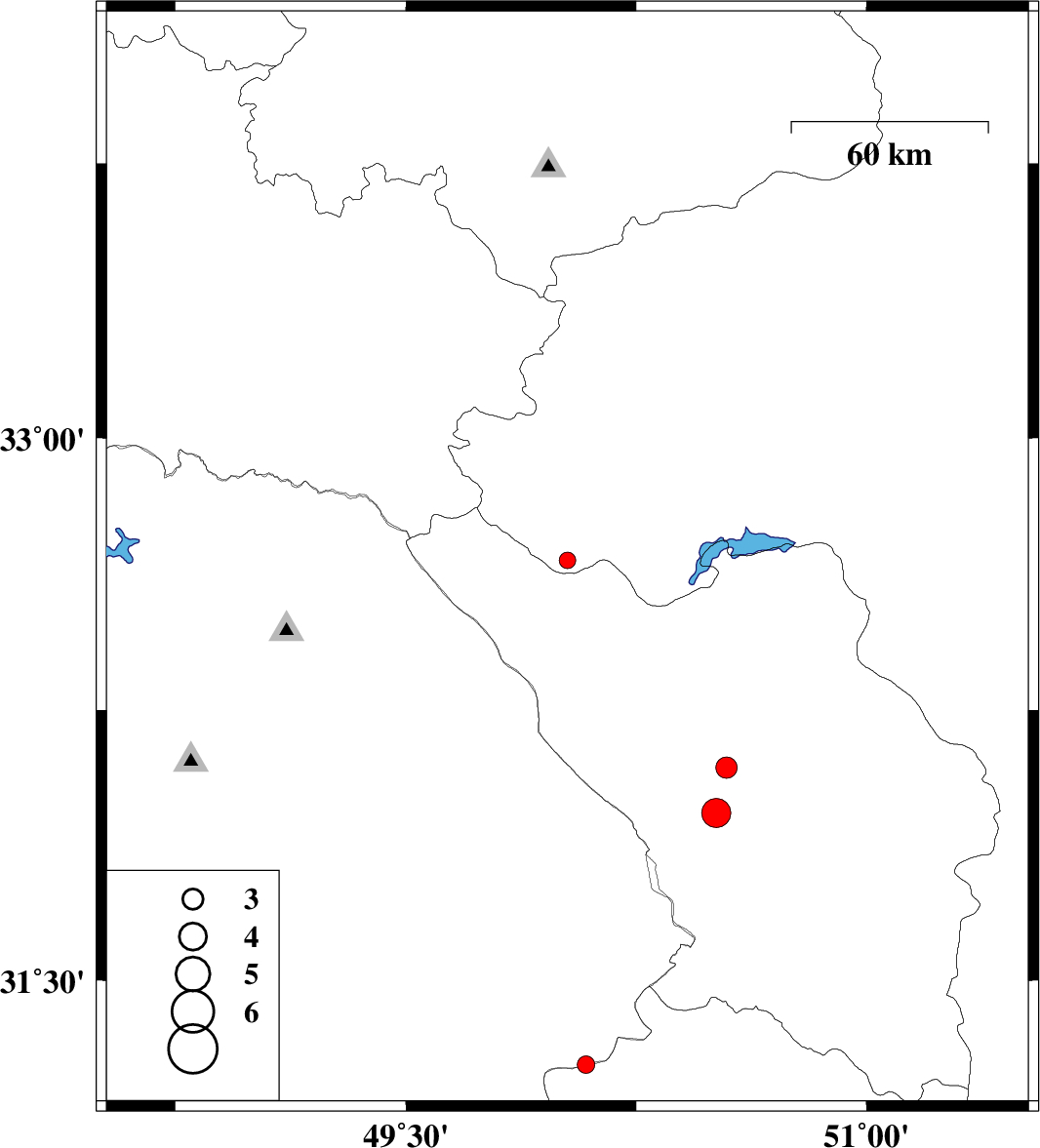 | 2016/07/04 | 09:46:12.6 | 14:16:12.6 | 31.264 | 50.087 | 15 | ML2.6 | Khoozestan Province, 33 km South-East of Bagh Malek |