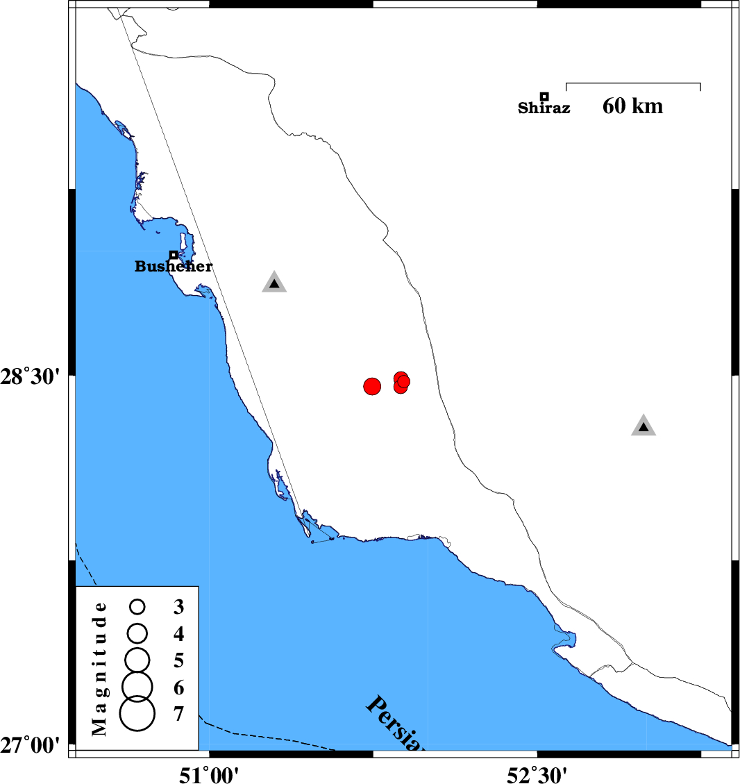 | 2016/07/06 | 07:12:59.5 | 11:42:59.5 | 28.454 | 51.744 | 21 | ML3.5 | Bushehr Province, 43 km South-East of Khormog |
