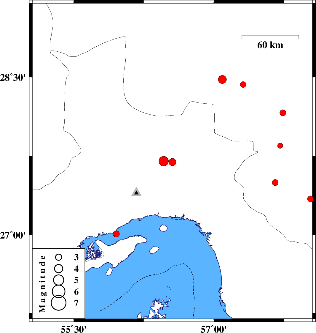 | 2016/06/20 | 03:58:18.2 | 08:28:18.2 | 27.85 | 57.712 | 15 | ML2.6 | Kerman Province, 11 km South of Kahnuj |
