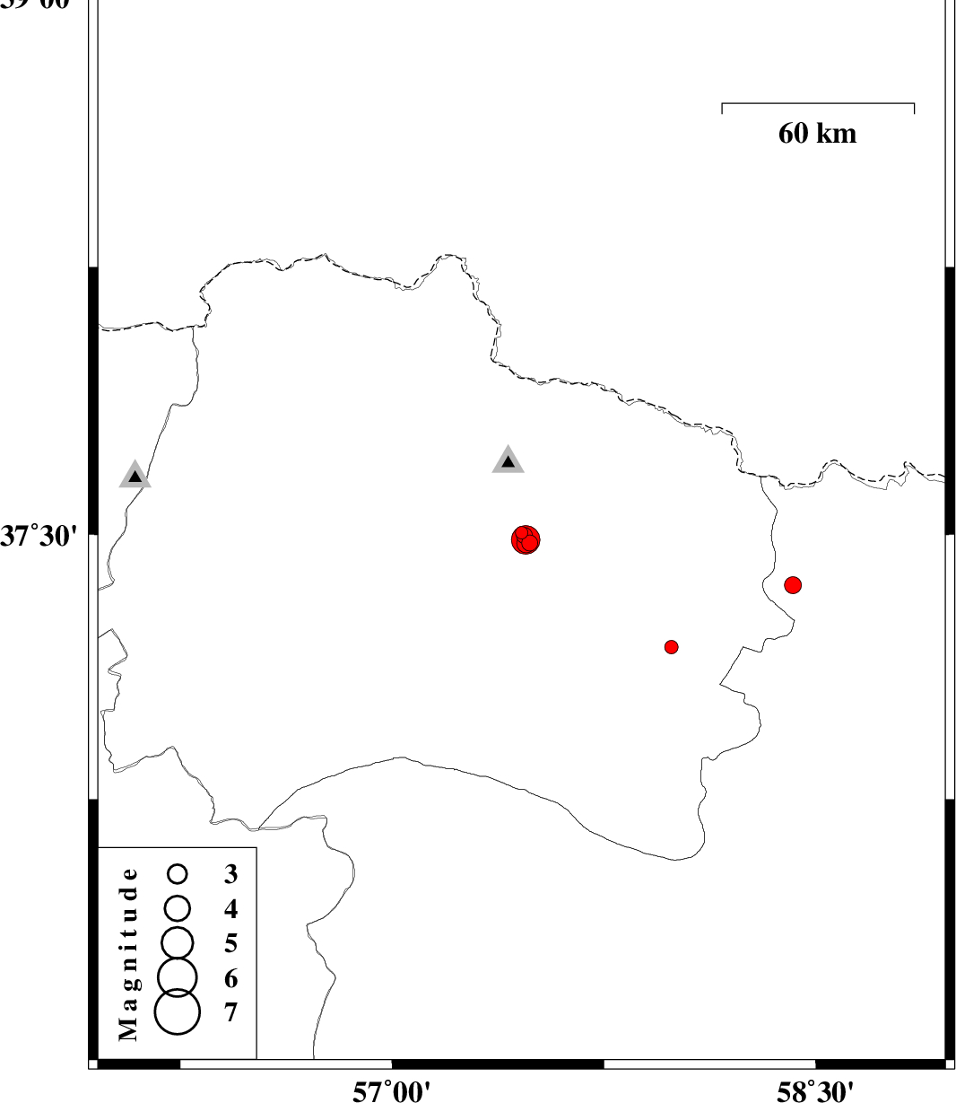 | 2016/07/02 | 00:47:50.8 | 05:17:50.8 | 37.474 | 57.474 | 14 | ML2.9 | Khorasan(north) Province, 13 km -East of Bojnurd | ||