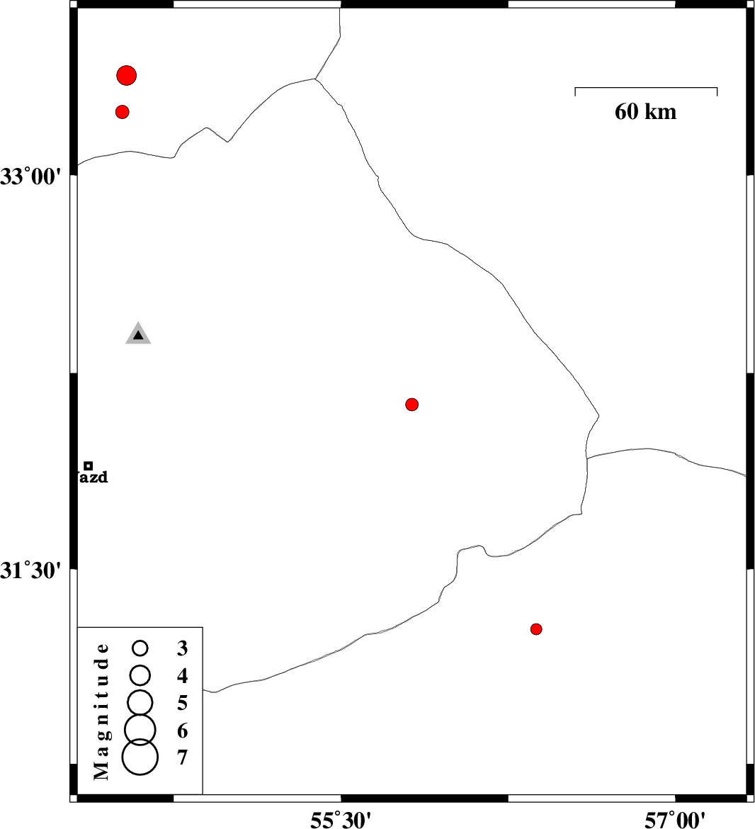 2016/07/06 | 09:01:32.1 | 13:31:32.1 | 33.376 | 54.539 | 6 | ML3.9 | Esfahan Province, 127 km North-East of Ardakan |