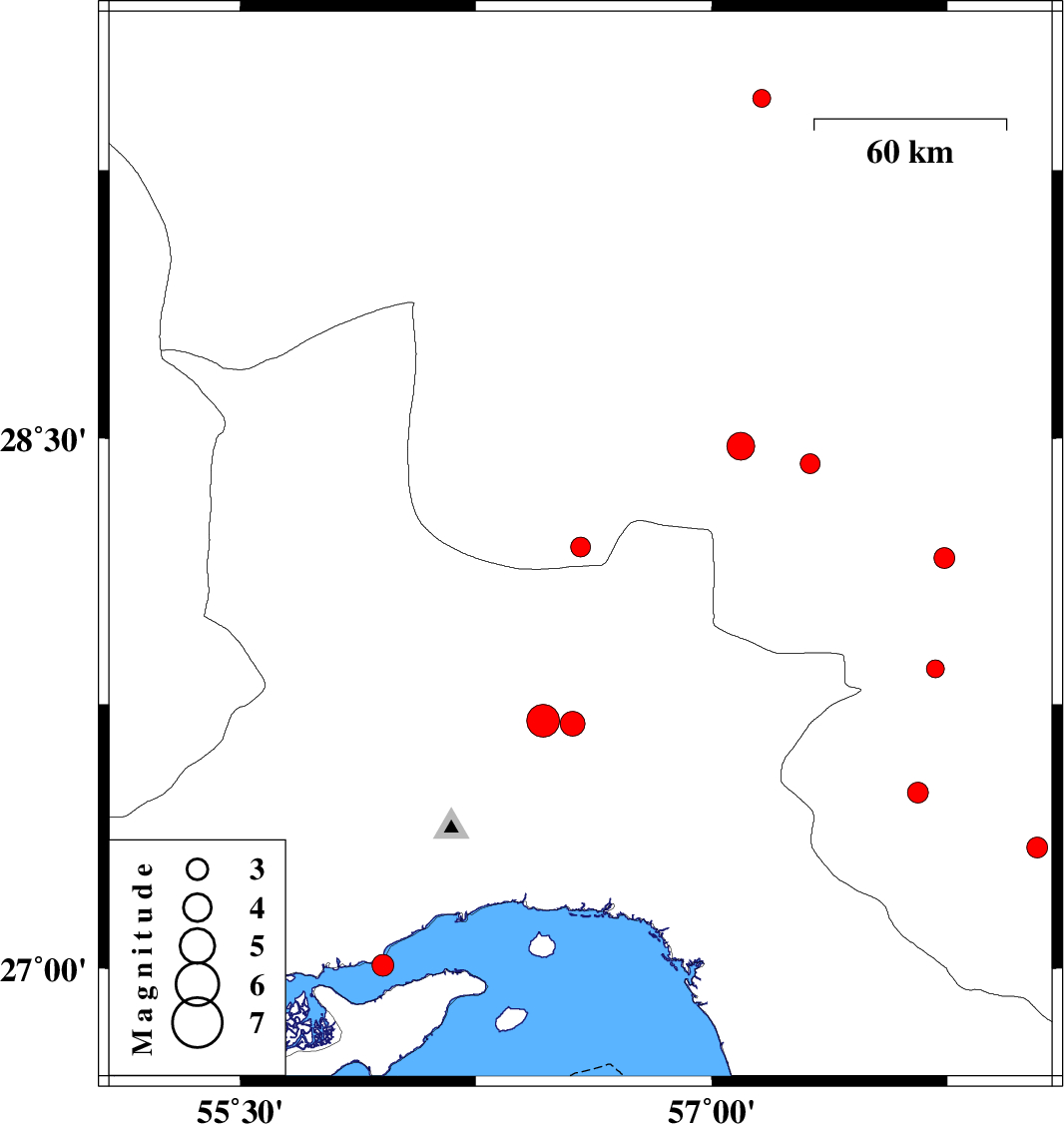 | 2016/06/20 | 03:58:18.2 | 08:28:18.2 | 27.85 | 57.712 | 15 | ML2.6 | Kerman Province, 11 km South of Kahnuj |