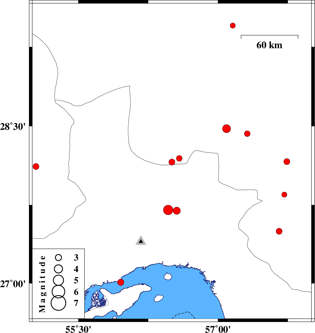 | 2016/06/20 | 03:58:18.2 | 08:28:18.2 | 27.85 | 57.712 | 15 | ML2.6 | Kerman Province, 11 km South of Kahnuj |