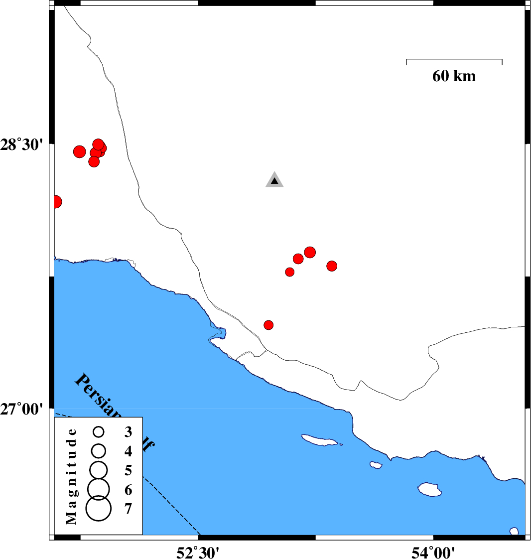| 2016/07/06 | 07:12:59.5 | 11:42:59.5 | 28.454 | 51.744 | 21 | ML3.5 | Bushehr Province, 43 km South-East of Khormog | ||