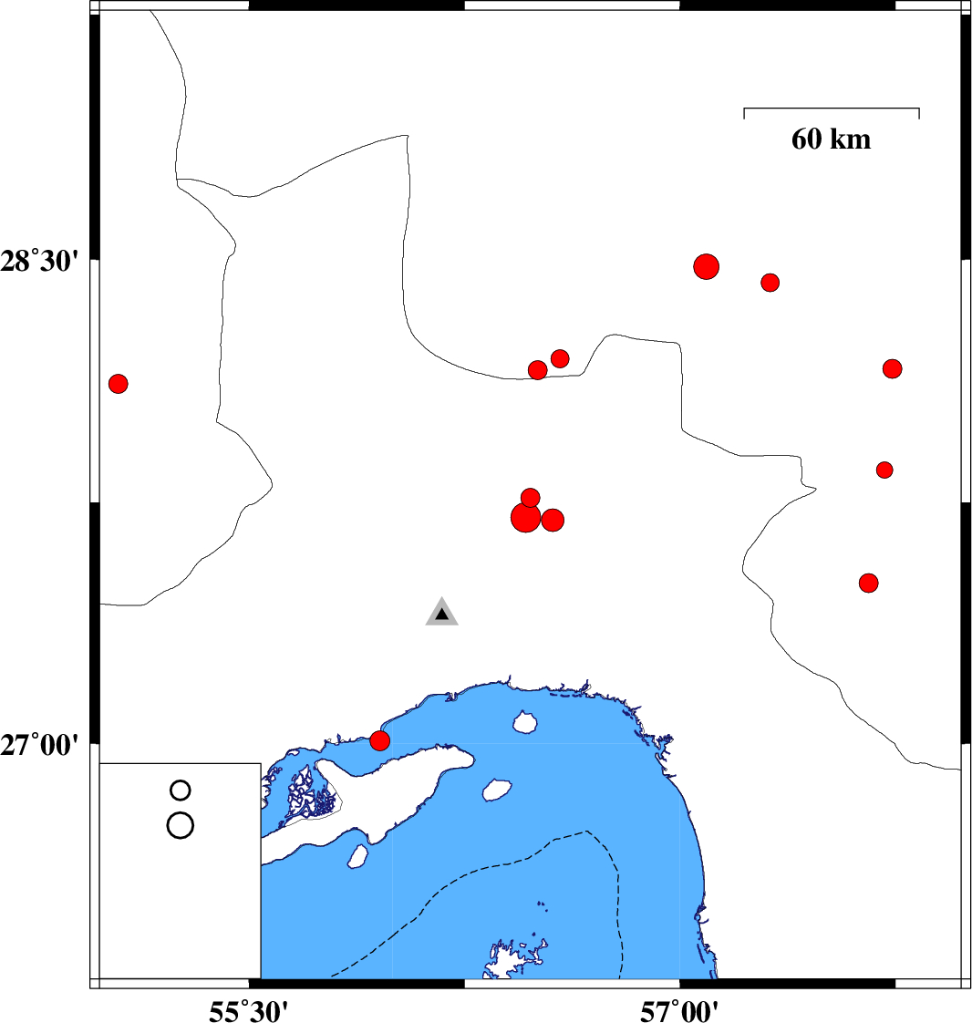 | 2016/07/16 | 02:46:20.5 | 07:16:20.5 | 28.117 | 55.044 | 15 | ML2.9 | Fars Province, 87 km South-West of Hajiabad | ||