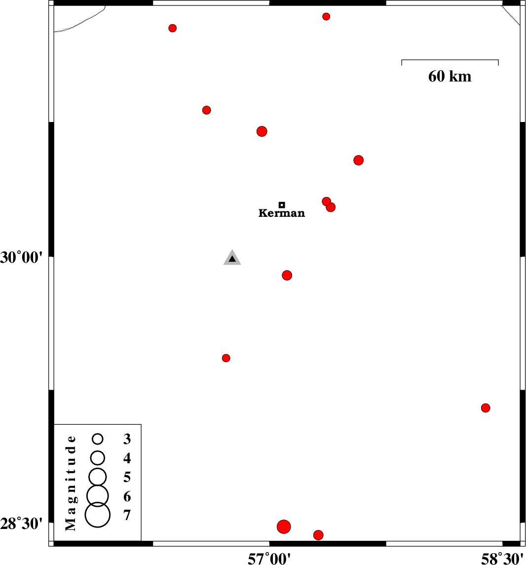 2016/06/26 | 05:38:55.8 | 10:08:55.8 | 28.477 | 57.092 | 15 | ML4 | Kerman Province, 67 km South-West of Jiroft |