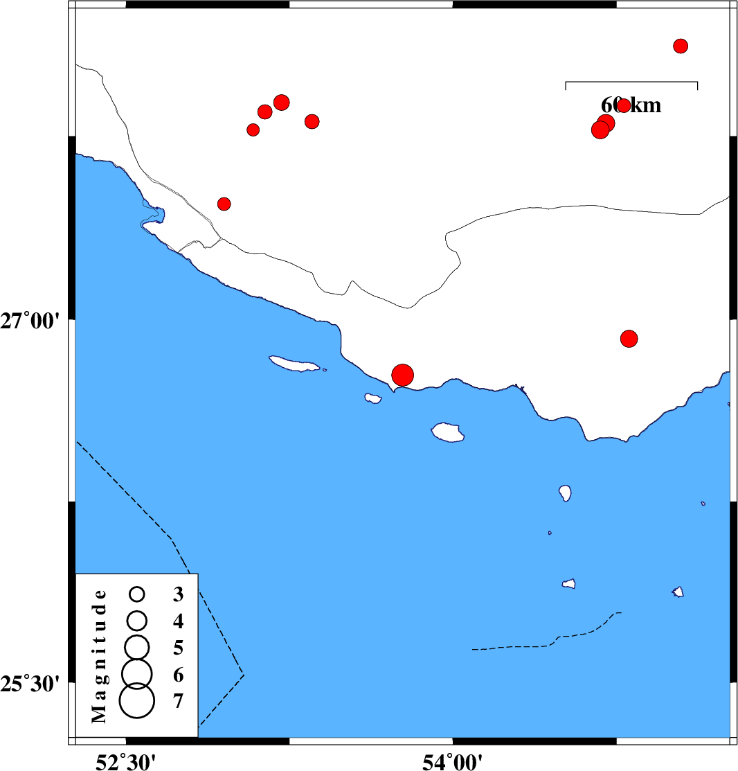 | 2016/07/12 | 22:43:05.3 | 03:13:05.3 | 26.921 | 54.808 | 15 | ML3.5 | Hormozgan Province, 44 km North of Bandar-e lengeh |