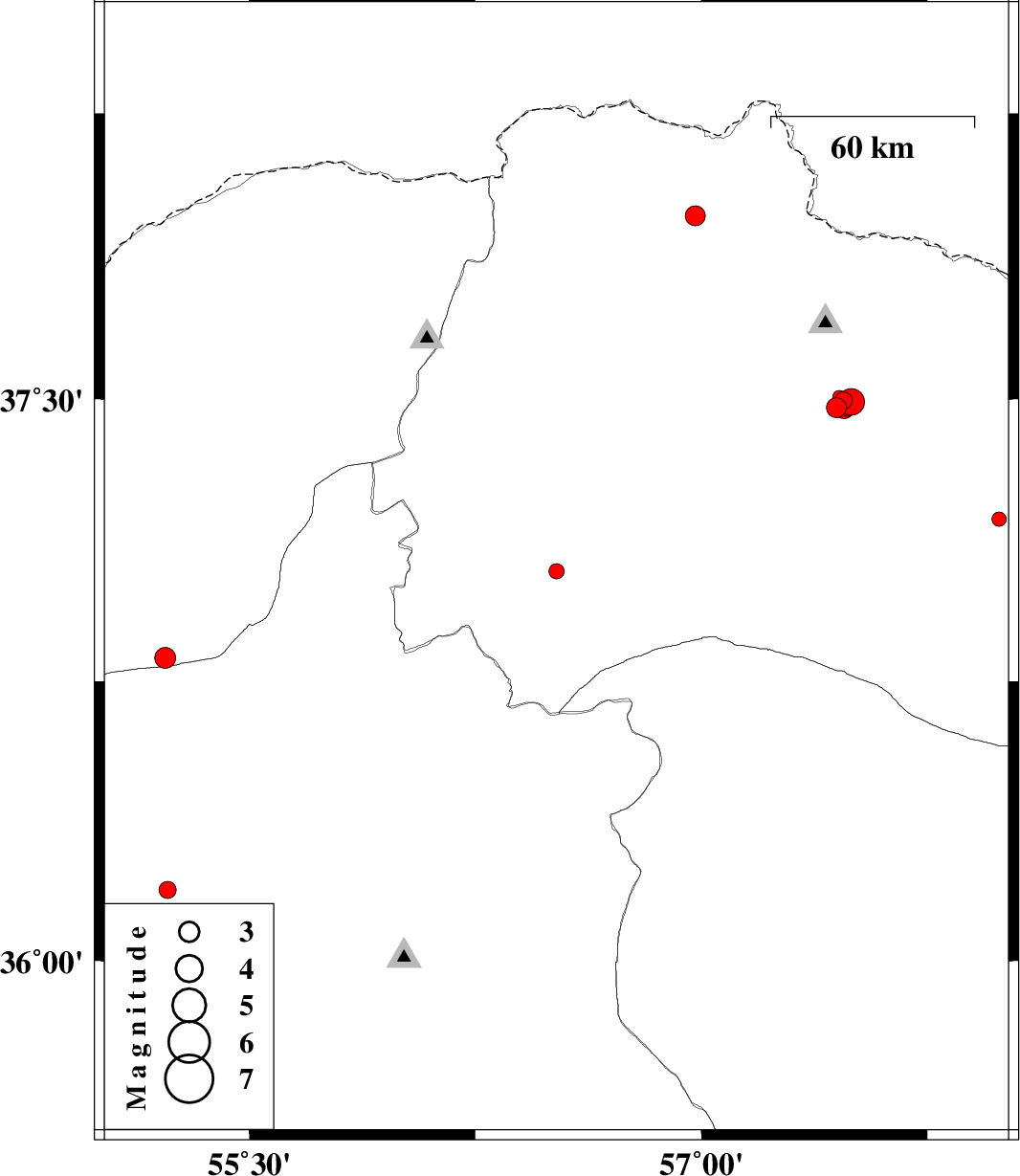 | 2016/07/30 | 04:31:57.6 | 09:01:57.6 | 37.043 | 56.519 | 8 | ML2.2 | Khorasan(north) Province, 15 km -East of Jajarm | ||