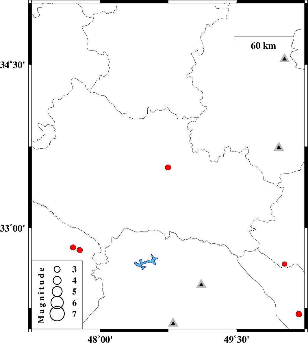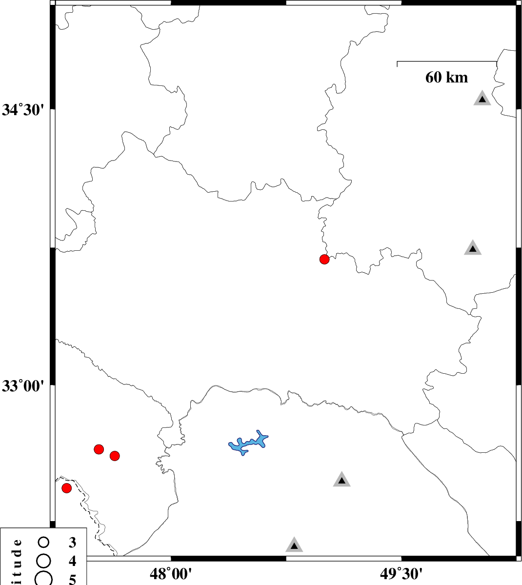 | 2016/08/01 | 04:24:41.1 | 08:54:41.1 | 33.557 | 48.746 | 14 | ML2.8 | Lorestan Province, 38 km South of Borujerd | ||