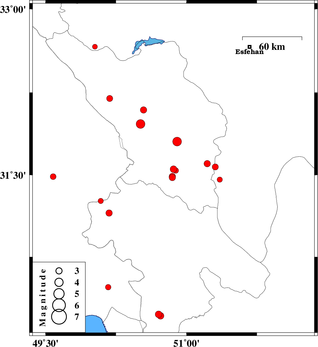 | 2016/07/08 | 15:11:21.1 | 19:41:21.1 | 32.663 | 50.026 | 15 | ML2.4 | Esfahan Province, 24 km North of Chelgard | ||