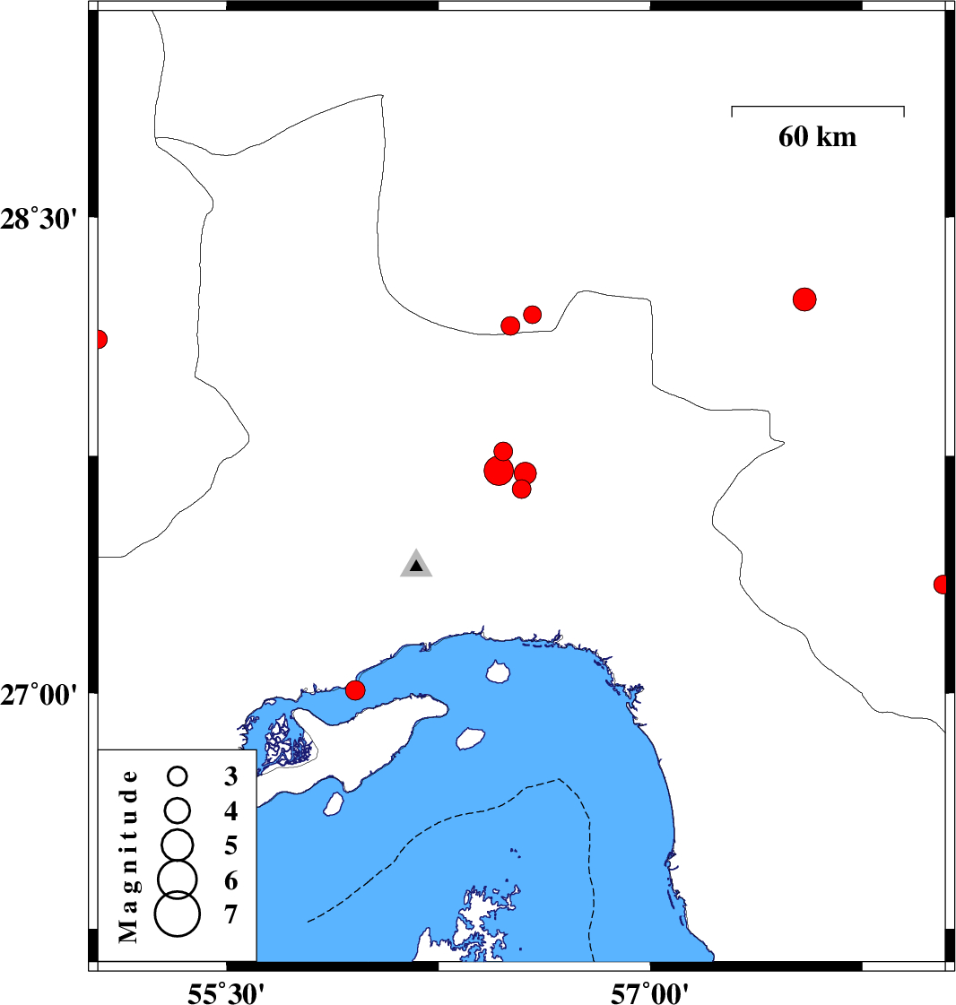| 2016/07/16 | 02:46:20.5 | 07:16:20.5 | 28.117 | 55.044 | 15 | ML2.9 | Fars Province, 87 km South-West of Hajiabad | ||