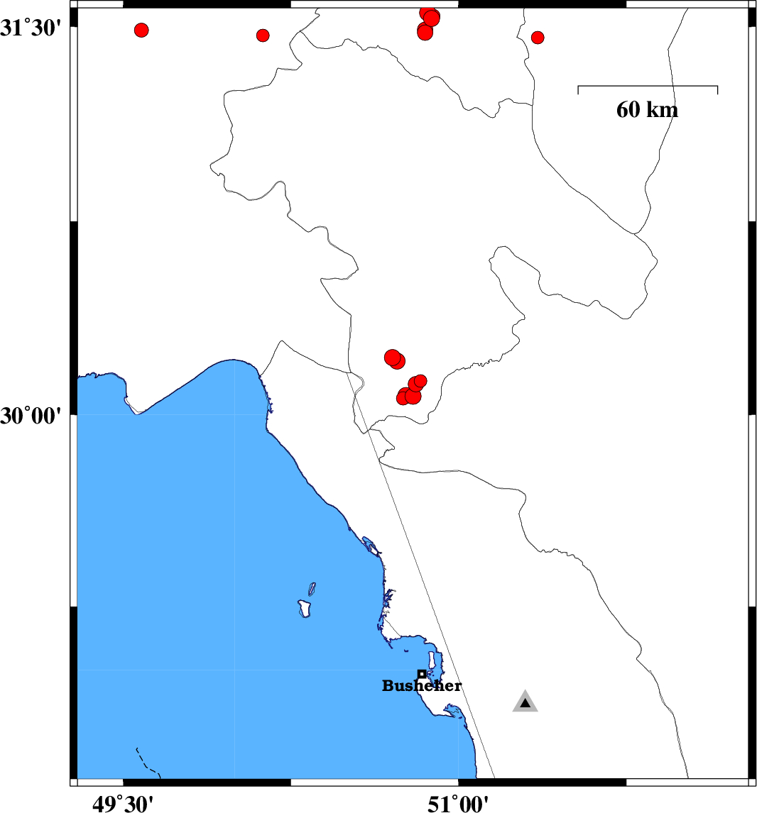 | 2016/08/09 | 17:05:14.5 | 21:35:14.5 | 30.074 | 50.765 | 10 | ML3.2 | Kohkiluieh va boyerahmad Province, 31 km South of Dogonbadan | ||