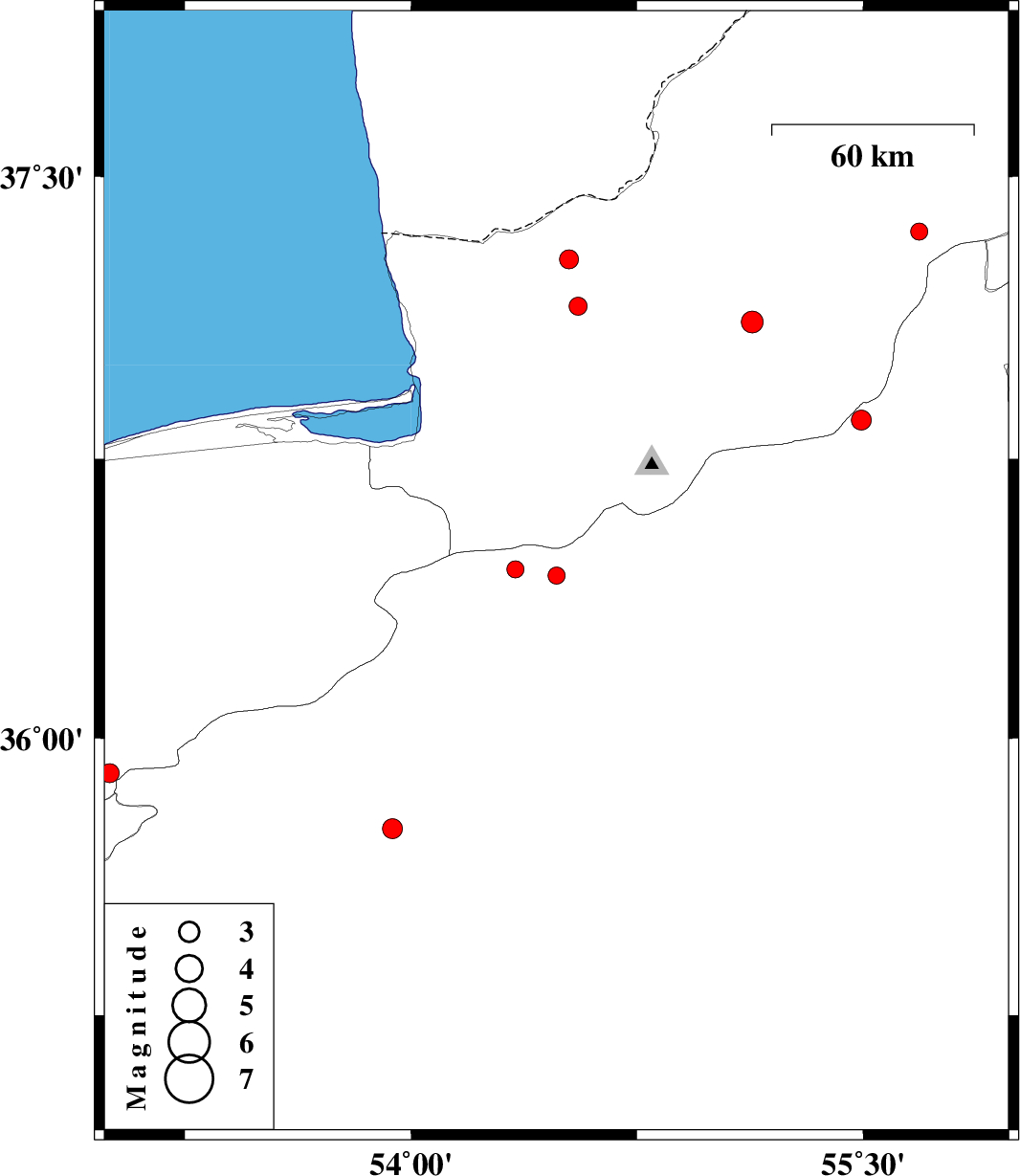| 2016/08/07 | 16:33:09.6 | 21:03:09.6 | 36.854 | 55.494 | 6 | ML2.9 | Semnan Province, 43 km South-East of Minodasht | ||