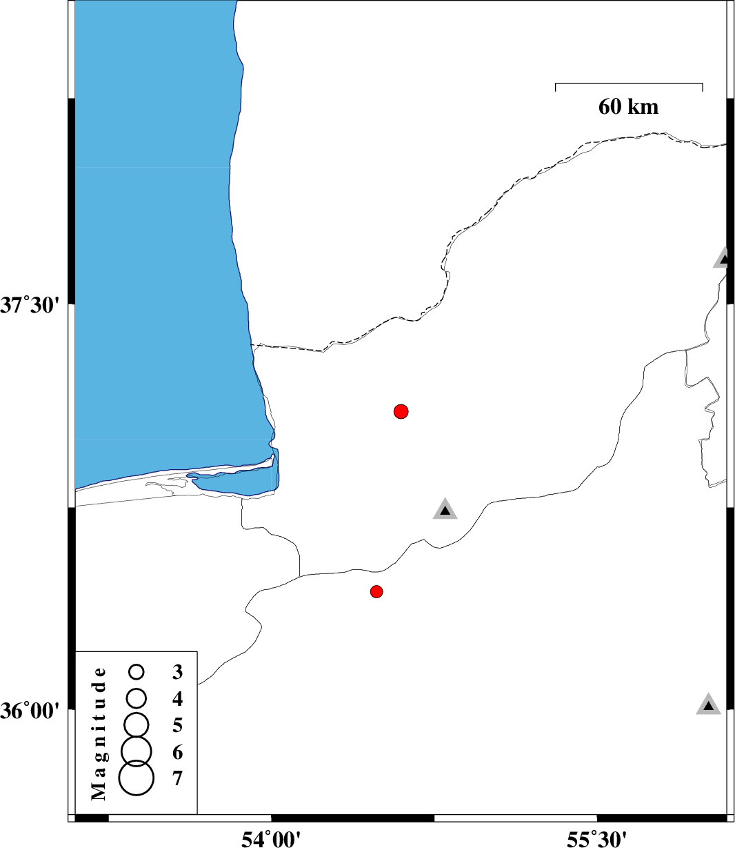 | 2016/08/15 | 06:55:22.1 | 11:25:22.1 | 37.105 | 54.596 | 14 | ML2.9 | Golestan Province, 16 km -East of Aq Qaleh | ||