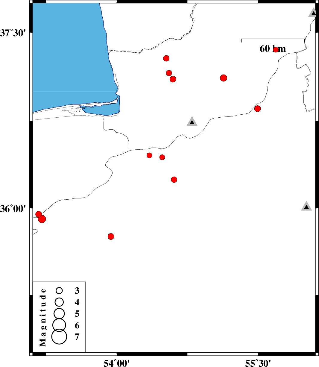 | 2016/08/15 | 06:55:22.1 | 11:25:22.1 | 37.105 | 54.596 | 14 | ML2.9 | Golestan Province, 16 km -East of Aq Qaleh | ||