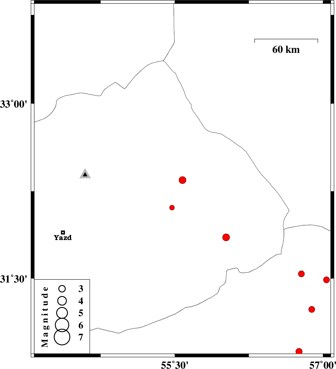 | 2016/08/19 | 14:01:06.3 | 18:31:06.3 | 32.346 | 55.578 | 15 | ML3.3 | Yazd Province, 84 km North-East of Bafq | ||