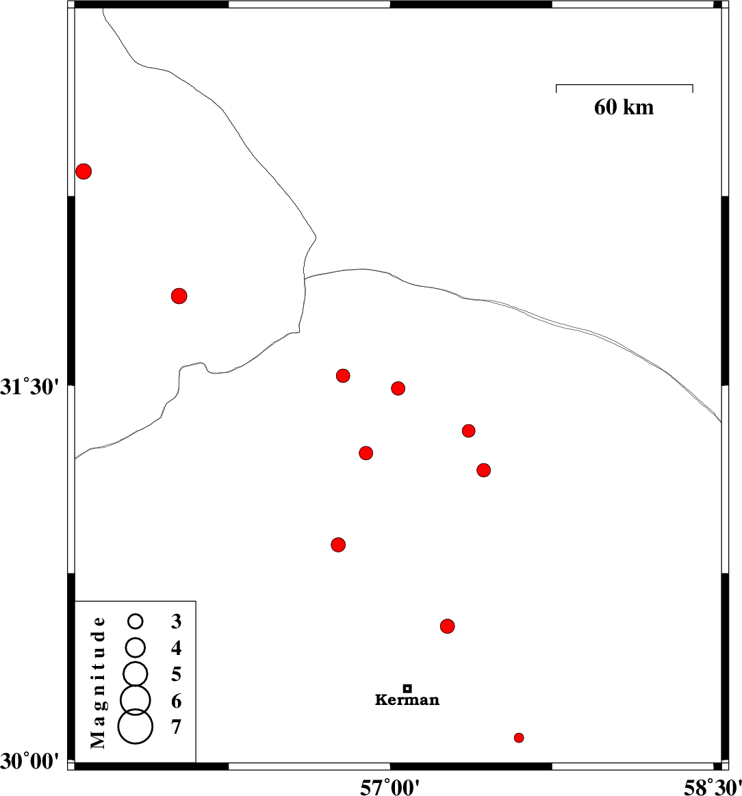 | 2016/08/16 | 15:13:18.9 | 19:43:18.9 | 30.538 | 57.264 | 14 | ML2.9 | Kerman Province, 33 km North-East of Kerman | ||